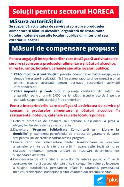 Alianța USR-PLUS propune o serie de măsuri de protecție pentru angajații și angajatorii din sectorul HORECA: