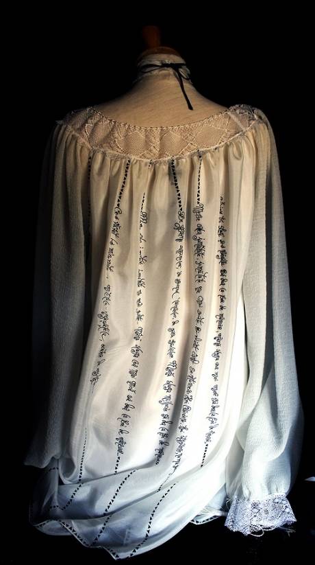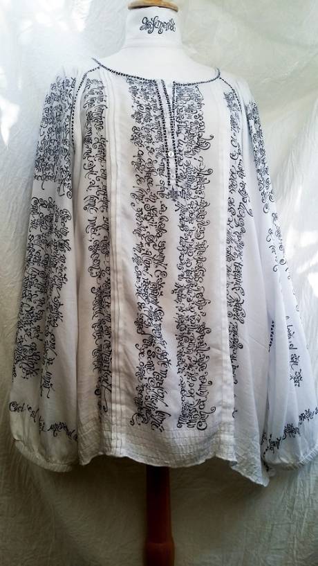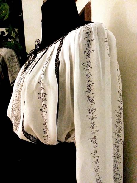Caligrafiez mai ales pe cămăși albe, aleg textele după ce mă inspiră piesa respectivă, volumul, croiul, și mai ales destinatarul. O anume cămașă a fost creată special pentru a primi un colind cules de prof. Ioan Apan sau un fragment din proza lui Calistrat Hogaș; o altă bluză poartă versuri de Nichita Stănescu, Voiculescu sau Ion Pillat, o rochie etalează un psalm… Kimonourile au inscripționate sonete de Shakespeare, panourile decorative sunt desenate cu cuvinte din Sadoveanu sau Sorescu.