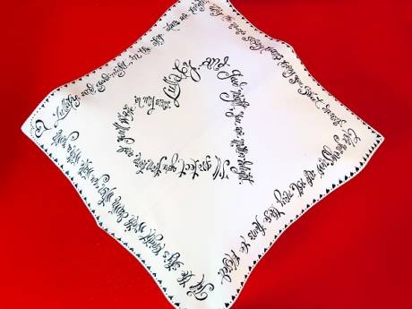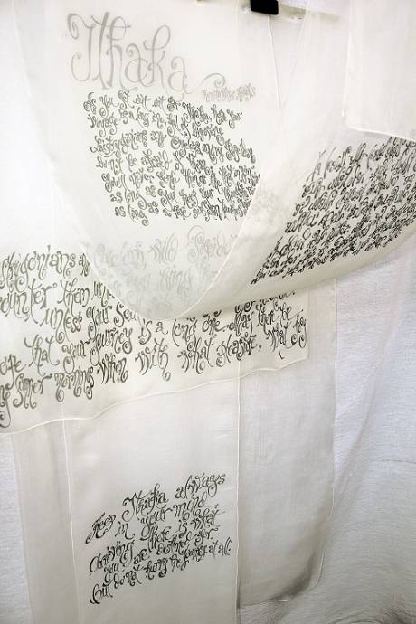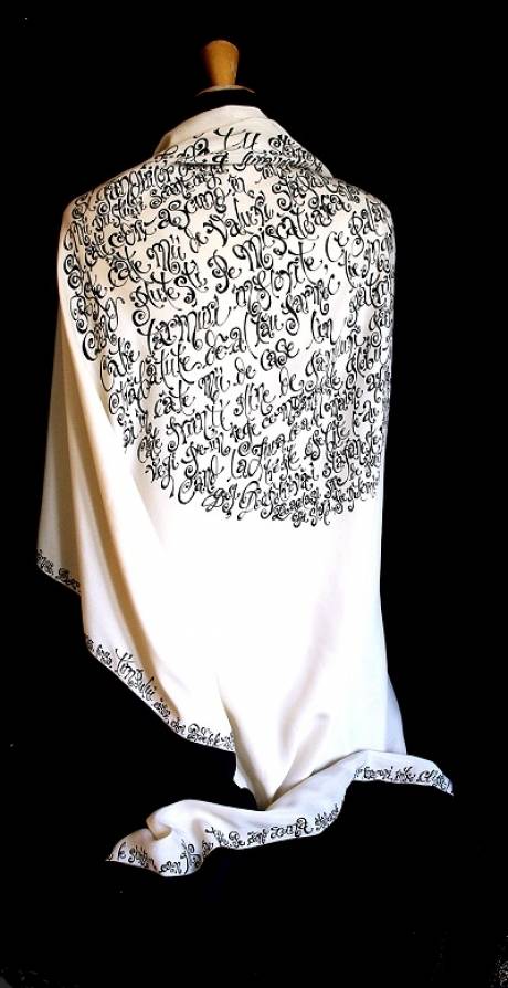 Prima ieșire la rampă a Grafemeridelor a fost în toamna trecută, la Castelul Pelișor, în cadrul expoziției „Zestrea” semnată de Liliana Țuroiu; am caligrafiat pe costume citate din scrierile Reginei Maria. Apoi, am scris texte în franceză, engleză, spaniolă, latină, ba și chiar în greacă, pentru un client ce-a dorit un text religios. Am scris și cântece de leagăn pe pernuțe și hăinuțe de botez, „Nunta Zamfirei” pe o rochie de mireasă, poemul „Ithaka” pe o perdea din opt straturi de voal. Sunt clienți care doresc un arbore genealogic cu versuri în loc de crengi… Sigur, există limitele estetice – nu am să scriu Voiculescu pe un trening – dar marea provocare este să găsesc și tipul de literă, și amplasarea textului în funcție de ce știu despre destinatar. Aflu, pe căi conspirative, ce preferințe are, ce hobbyuri, ce citește, unde a călătorit. De aici, satisfacția enormă că pot contribui la bucuria unui om, creînd un cadou personalizat.