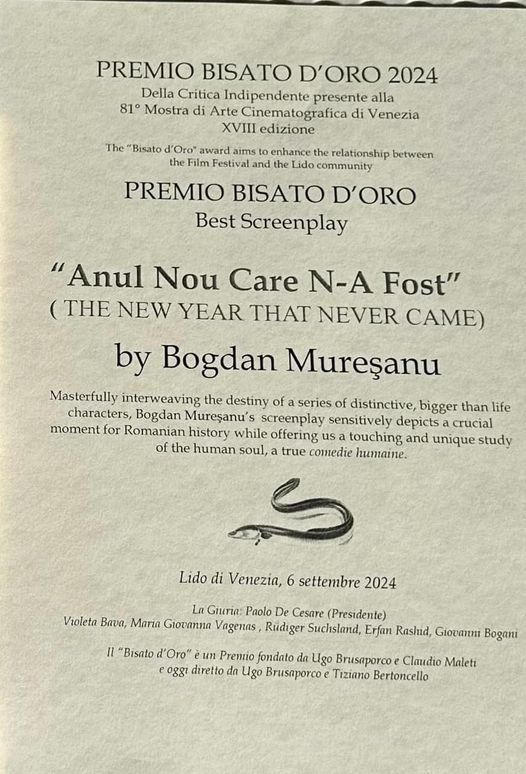 Filmul „Anul nou care n-a fost”, regizat, scris şi produs de Bogdan Mureşanu, a fost desemnat cel mai bun film la secţiunea Orizzonti în cadrul celei de-a 81-a ediţii a Festivalului Internaţional de Film de la Veneţia, informează site-ul oficial al evenimentului.