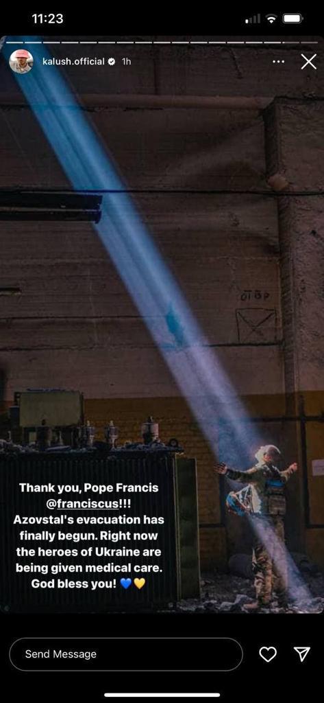 Săptămâna trecută, soțiile militarilor din Azov l-au rugat pe Papa Francisc să se implice pentru ca soții lor să poată părăsi platforma industrială unde se refugiaseră de săptămâni întregi, printr-un coridor umanitar. Întâlnirea dintre acestea și Suveranul Pontif a avut loc la Vatican și nu a durat mai mult de 5 minute, după audiența generală obișnuită. Acum, după ce „evacuarea” soldaților din Azovstal s-a produs, inclusiv câștigării ucraineni ai concursului Eurovison și-au exprimat gratitudinea față de implicarea Papei.
