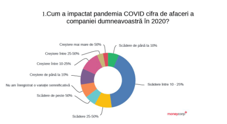 Așa se explică și faptul că, întrebați cum le-au fost influențate afacerile in perioada de pandemie, 41% dintre companii au indicat o scădere a cifrei de afaceri cu 10-25%. Numai 16% au indicat o scădere mai mare de acest procent și, foarte interesant, puțin peste 20% au indicat o creștere a business-ului cu până în 25%. Acest lucru demonstrează că managerii români au învățat lecția crizei precedente și s-au adaptat destul de rapid la noua realitate economică, reușind, în mare parte, să preîntâmpine o scădere economică puternică’’, a declarat Claudiu Ghebaru, Senior Corporate Dealer in cadrul companiei.