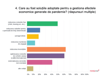 Pe lista măsurilor luate s-au mai aflat optimizarea costurilor de schimb valutar și plăți internaționale (58%), externalizarea serviciilor non-esențiale (41%), reducerea salariilor pentru o perioadă de timp determinată (21%), șomajul tehnic (19%) și reducerea numărului de angajați, în linie cu scăderea activității (13%).