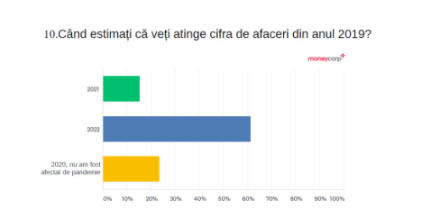 Potrivit rezultatelor barometrului, în condițiile optimismului moderat privind perspectivele economiei, cele mai multe companii (61%), se așteaptă ca abia în 2022 să atingă nivelul cifrei de afaceri din 2019. 15% estimează că vor recupera în 2021 cifra de afaceri din 2020, în timp ce 23% estimează că afacerile, în 2021, vor urma un trend stabil, nefiind influențați de efectele pandemiei (în general companii care au avut de câștigat de pe urma pandemiei).