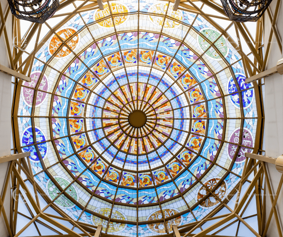 Cupola se sprijină pe 12 stâlpi de metal, reprezentându-i pe cei 12 apostoli ai Mântuitorului Hristos. Vitraliul se află la aproximativ 30 de metri distanță de nivelul zero al edificiului. Deci, da, putem spune că este o capelă sixtină locală!