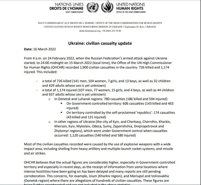 Biroul Înaltului Comisar al ONU pentru Drepturile Omului (OHCHR) a prezentat bilanțul victimelor civile din Ucraina, de la începutul războiului până în 15 martie.