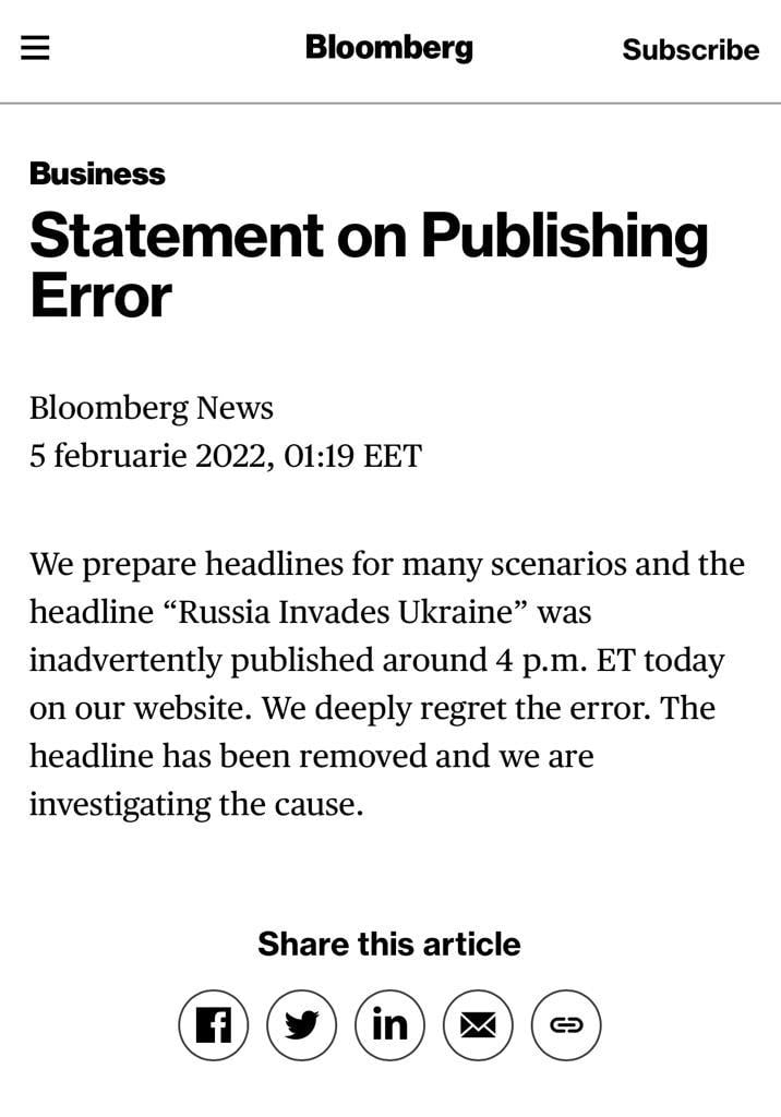 Ce s-a întâmplat? Agenția a titrat astăzi că Rusia a invadat Ucraina. Titlul a stat pe site-ul Bloomberg aproximativ o jumătate de oră, după care a fost sters.