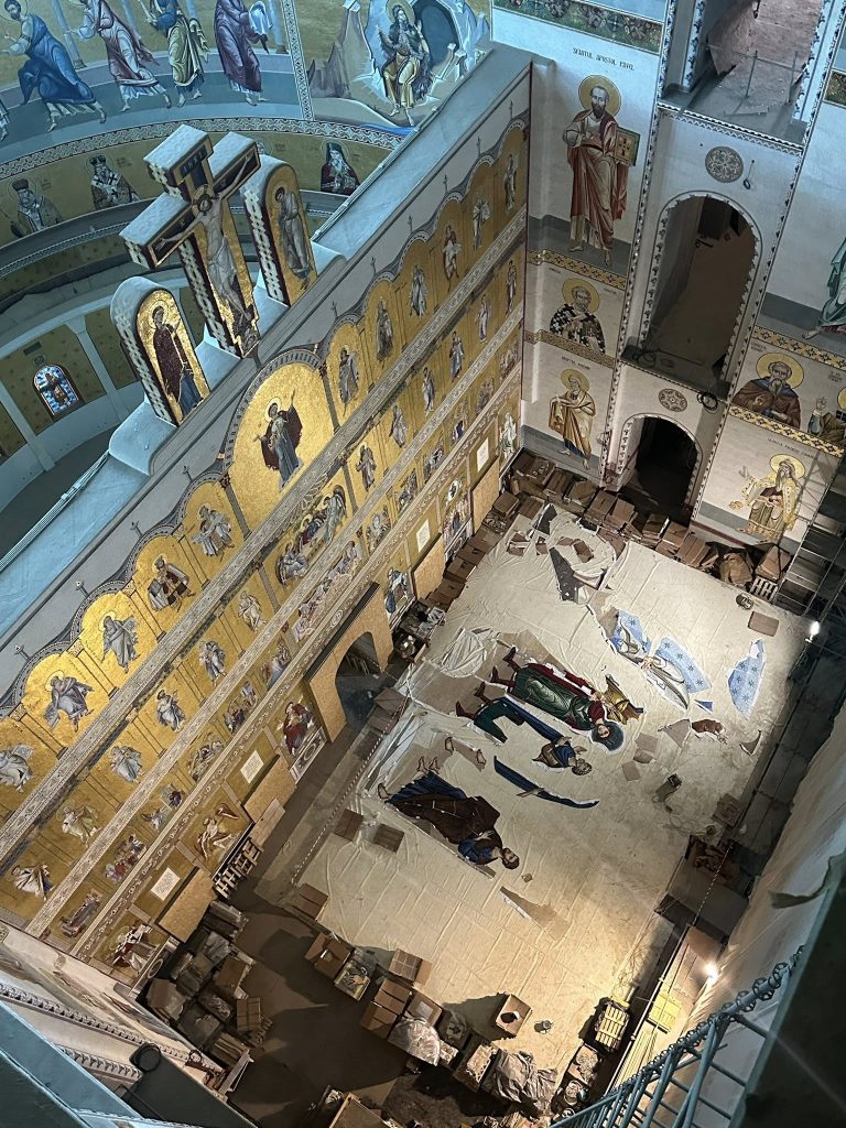 Imagine din Atelierul de pictură al Catedralei Naționale, unde peste 200 de pictori bisericești au lucrat sute de metri pătrați de mozaic lunar în ultimul an. Foto: Arhiva Basilica.ro / Raluca Ene