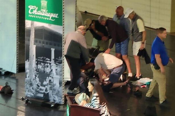 În fotografiile şi imaginile video postate pe reţelele sociale, o persoană, identificată drept Rushdie, poate fi văzută primind îngrijiri pe scenă.