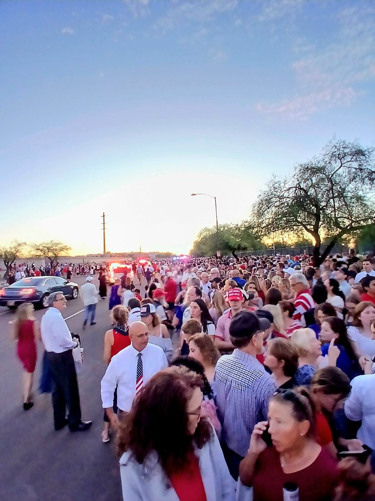 Oamenii se răcoreau reciproc în căldura toridă, în timp ce așteptau să treacă prin detectoarele de metale. Un bărbat în vârstă a căzut la pământ și a fost scos din rând pentru a primi ajutor. Din când în când izbucneau certuri din cauza celor care se băgau în față: cineva a strigat „liberalii!” la un grup care încerca să se deplaseze în față.