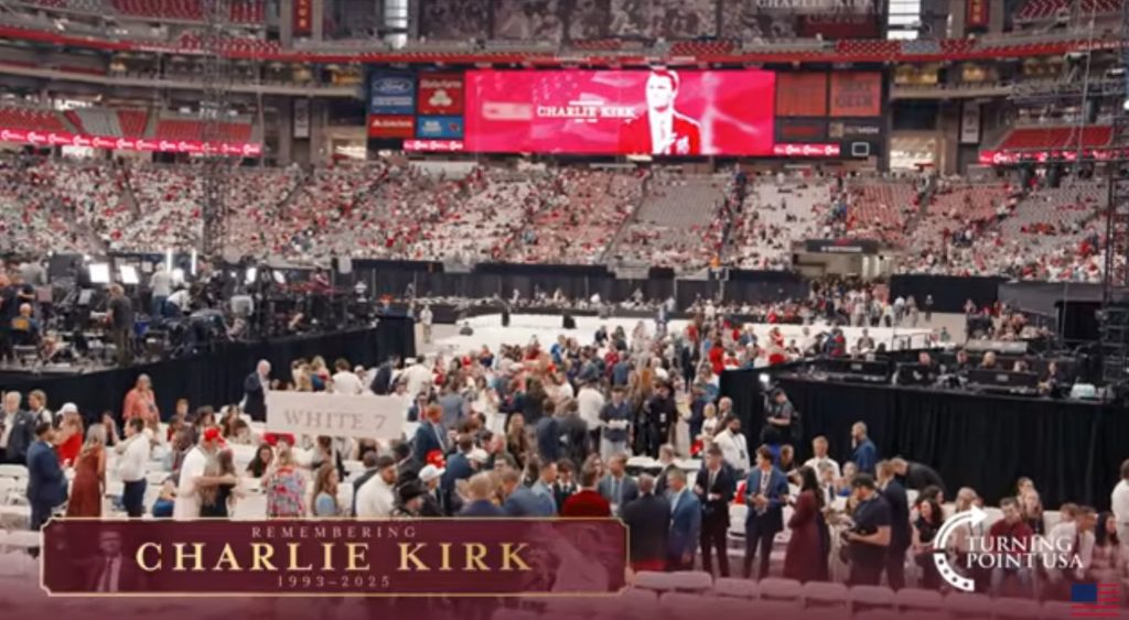 În timp ce ecranele mari au redat videoclipul evenimentului lui Charlie Kirk de la Universitatea Utah Valley din 10 septembrie – ziua în care a fost împușcat și ucis – o tăcere profunda s-a asternut peste mulțimea care urmărea ultimele momente din viața lui Kirk. Imaginile cu un Kirk emoționat aruncând pălării în mulțime, râzând la începutul turneului său de colegiu, nu trădează nimic din tragedia care urma să se petreacă.