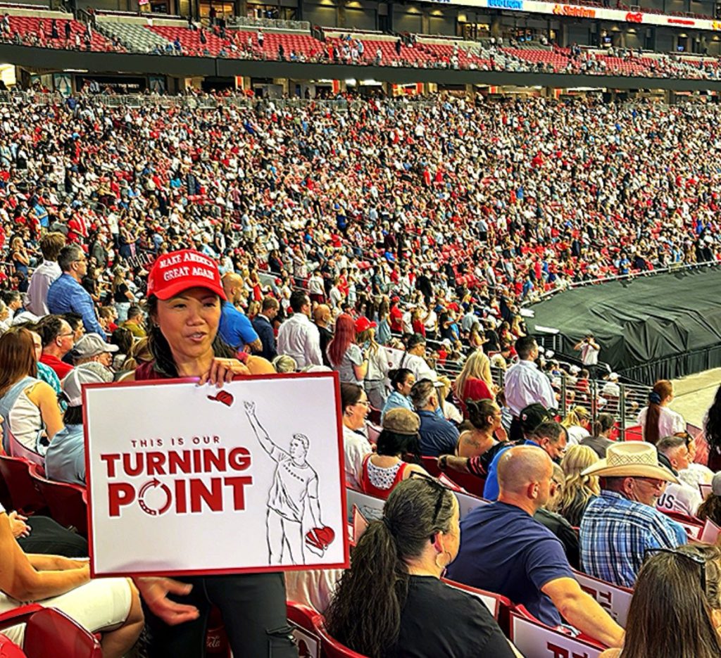Steaguri americane mari atârnau de ambele părți ale scenei principale, care era decorată în maro și auriu. Ecrane gigantice arătau fotografii cu Kirk, inclusiv una în care se apleacă să-și sărute soția, Erika, aleasă săptămâna trecută director executiv al Turning Point.
