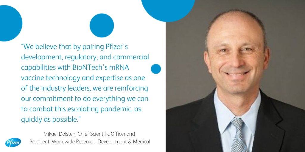 Noul vaccin Pfizer COVID-19, la fel ca cel anunțat luni de compania americană de biotehgnologie, Moderna, este fabricat din mRNA (ARN mesager), o tehnologie relativ nouă despre care Dolsten spune că va permite companiilor să combată pandemiile în viitor cu o viteză și eficiență uluitoare. Ratele de succes ale vaccinurilor până acum l-au impresionat pe Anthony Fauci, cel mai mare expert din SUA în boli infecțioase, care a declarat că speră la o rată de succes de 75%.