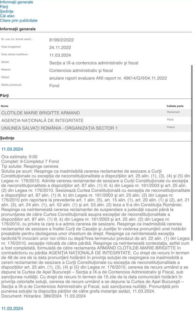 „Respinge ca neîntemeiată contestaţia, astfel cum a fost completată, formulată de către reclamanta Armand Clotilde – Marie – Brigitte în contradictoriu cu pârâta Agenţia Naţională de Integritate”, se arată în decizia instanţei, care nu este definitivă şi poate fi atacată cu recurs.