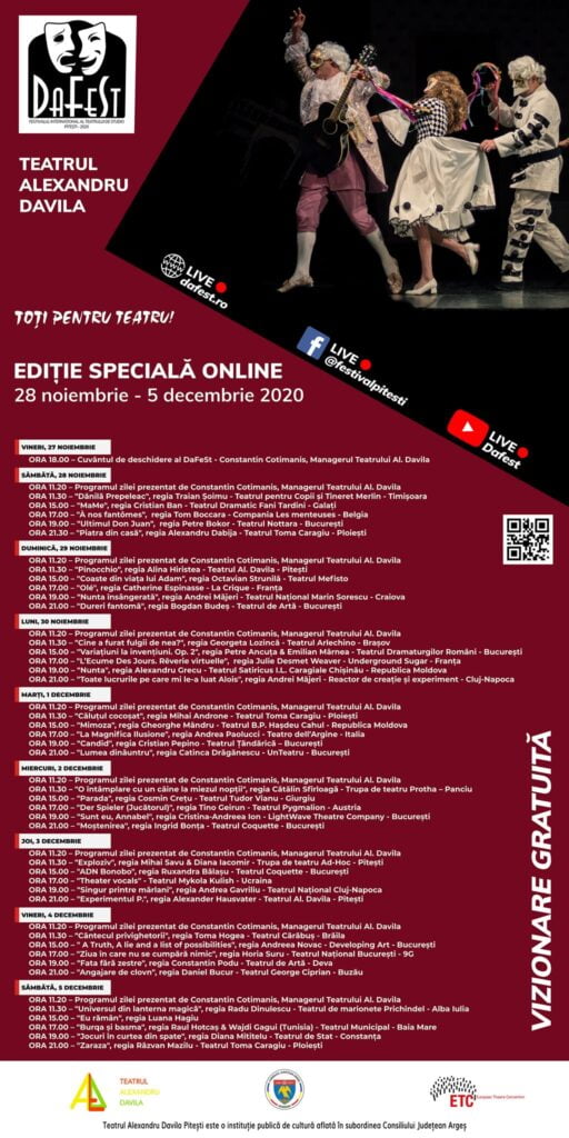 Programul DaFeSt – Festivalul Internațional al Teatrului de Studio, ed. a XXIV-aSpectacolele vor putea fi urmărite în perioada 28 noiembrie – 5 decembrie pe: