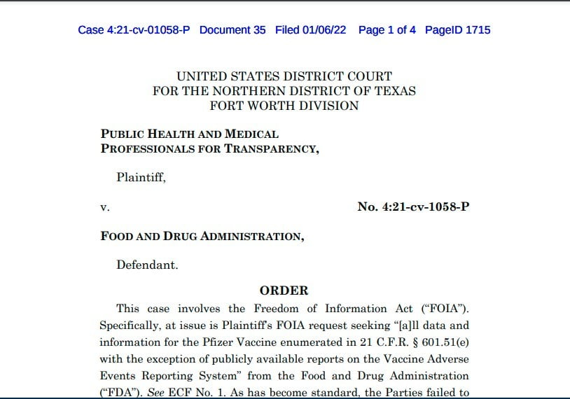 În esență, joi, 6 ianuarie, Dr. jur. Mark Pittman, judecătorul federal în Texas, a hotărât că FDA are la dispoziție 8 luni pentru a elibera documentele solicitate de organizația reclamantă. El a considerat că dată fiind importanța cazului, onorarea acestei solicitări trebuie să fie prioritară.