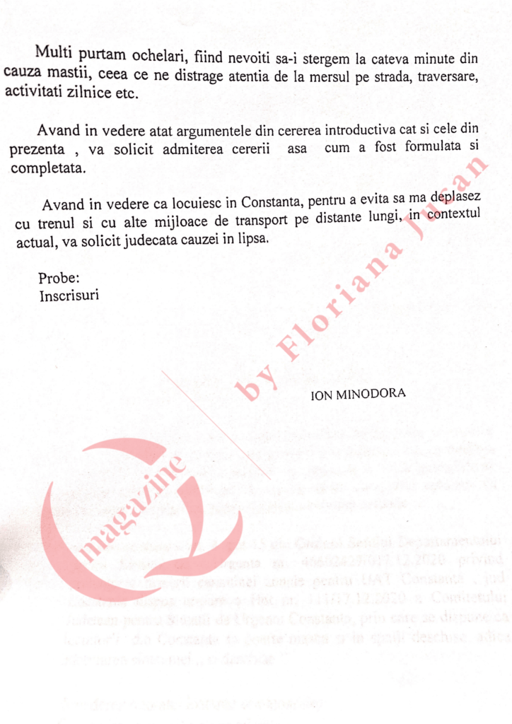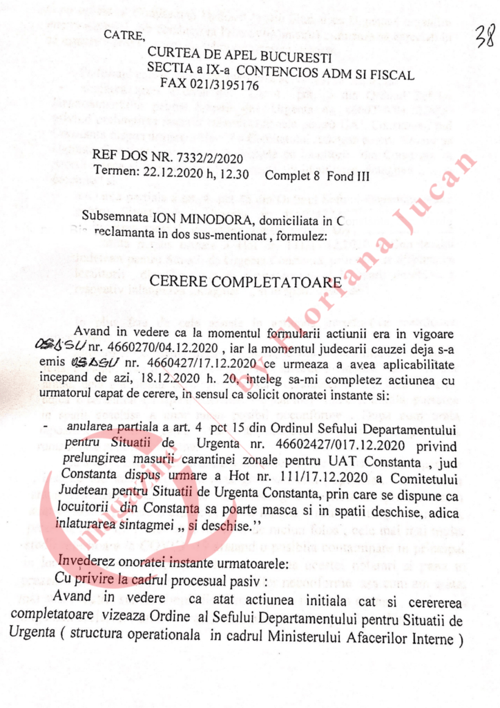 Amintim că avocata Minodora Ion, membru al Baroului Constanţa, a atacat Art. 4 pct. 15 din Ordinul Şefului Departamentului pentru Situații de Urgenţă nr. 4660270/04.12.2020 care prevede obligativitatea purtării măștii în spații deschise în Constanţa.