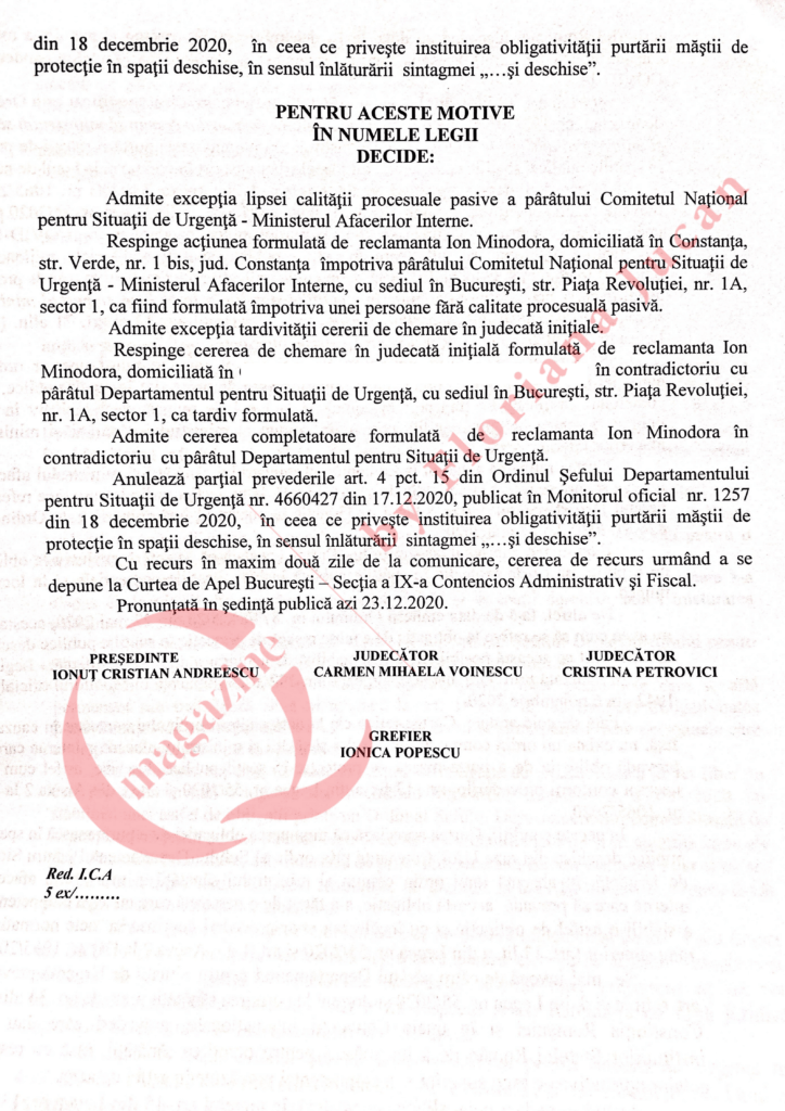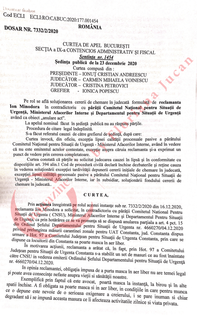 Curtea de Apel a admis „cererea completatoare formulată de reclamanta Ion Minodora în contradictoriu cu pârâtul Departamentul pentru Situații de Urgență” şi a anulat parțial prevederile art. 4 pct. 15 din Ordinul Șefului Departamentului pentru Situații de Urgență nr. 4660427 din 17.12.2020, publicat în Monitorul oficial nr.1257 din 18 decembrie 2020, în ceea ce privește instituirea obligativității purtării măştii de protecție în spații deschise, în sensul înlăturării sintagmei … și deschise.