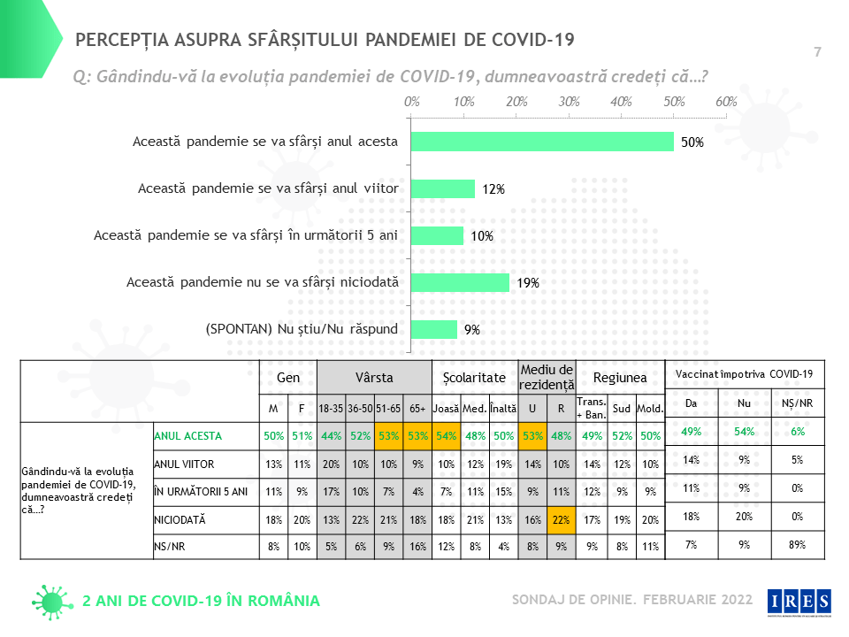 Jumătate dintre respondenți cred că actuala pandemie se va sfârși anul acesta; dar aproape 1 din 5 români (19%) crede însă că aceasta nu se va sfârși niciodată. 12% dintre respondenți sunt de părere că sfârșitul actualei pandemii va fi anul viitor, în timp ce 10% apreciază că se va sfârși în următorii 5 ani.