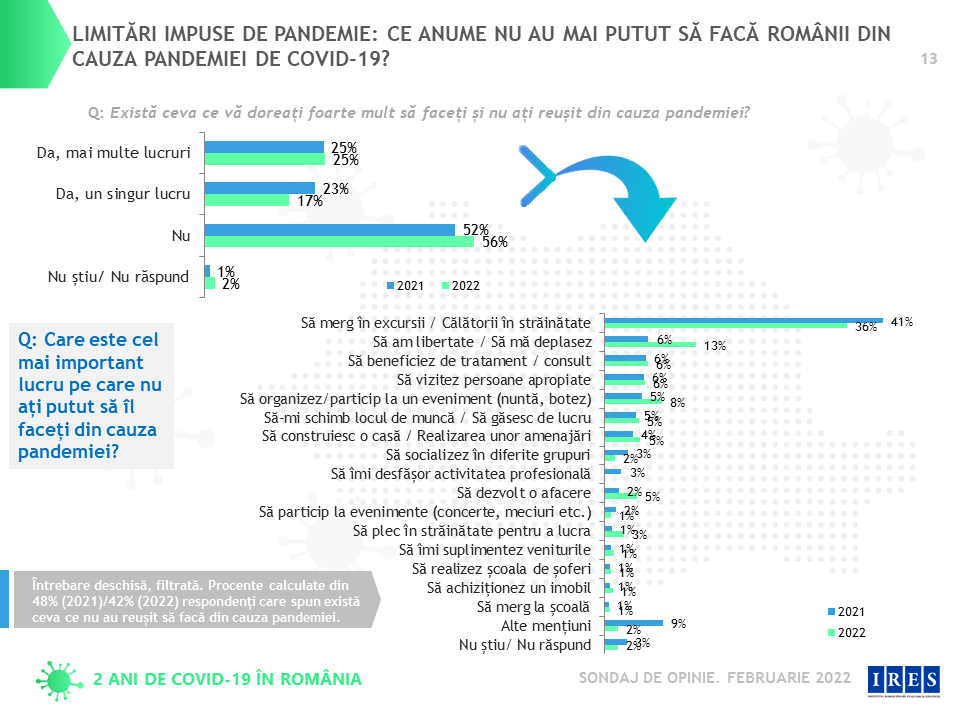 Excursiile ori călătoriile în străinătate sunt invocate de către majoritatea respondenților, iar 8% dintre respondenți spun că nu au mai putut să organizeze sau să participe la un eveniment în familie, precum nunți sau botezuri. 6% spun că nu au mai putut să aibă acces la un tratament sau la un consult medical, iar un procent similar că nu și-au mai putut vizita persoanele apropiate, 5% dintre intervievați susțin că nu au mai putut să își găsească un loc de muncă sau să și-l schimbe pe cel pe care îl aveau, un procent similar nu au putut să își dezvolte o afacere, 5% nu au mai putut să își construiască sau să își amenajeze locuința. 3% spun că nu au mai putut pleca în străinătate să lucreze.