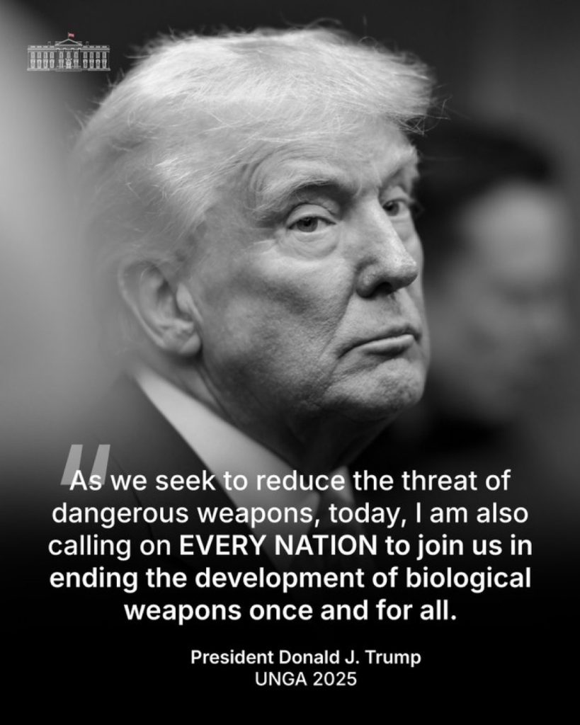 Acum câțiva ani, experimentele nesăbuite din străinătate ne-au dat o pandemie globală devastatoare, dar, în ciuda acelei catastrofe mondiale, multe țări continuă cercetări extrem de riscante în arme biologice și agenți patogeni creați de om. Acest fapt este incredibil de periculos. Pentru a preveni dezastrele potențiale, anunț astăzi că administrația mea va conduce un efort internațional pentru a pune în aplicare convenția privind armele biologice, care se va întâlni cu liderii de top ai lumii prin pionieratul unui sistem de verificare bazat pe inteligență artificială în care toată lumea poate avea încredere. Sperăm că ONU poate juca un rol constructiv și că va fi, de asemenea, unul dintre primele proiecte sub IA. Să vedem cât de bun este pentru că mulți spun că ar putea fi una dintre cele mai mari realizări obținute vreodată, dar poate fi și periculos. Ar putea fi folosit pentru un beneficiu extraordinar, și acesta ar fi un exemplu în acest sens.