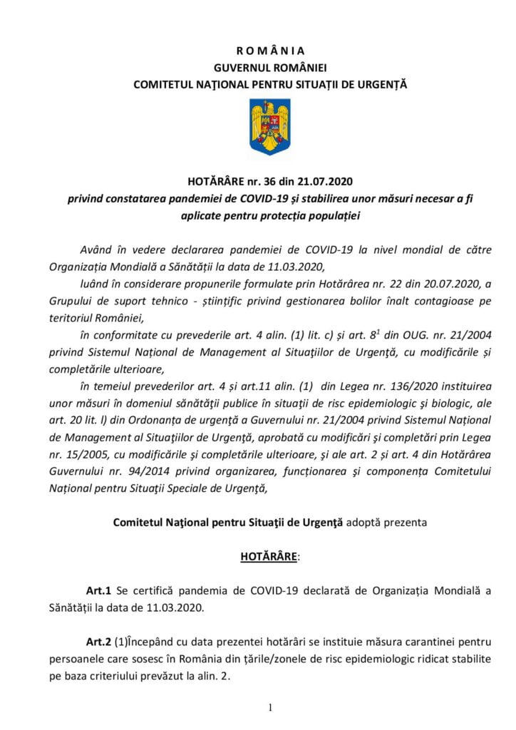 Printre motivele enumerate pentru adoptarea acestei hotărâri se regăsește „declararea pandemiei de COVID-19 la nivel mondial de către