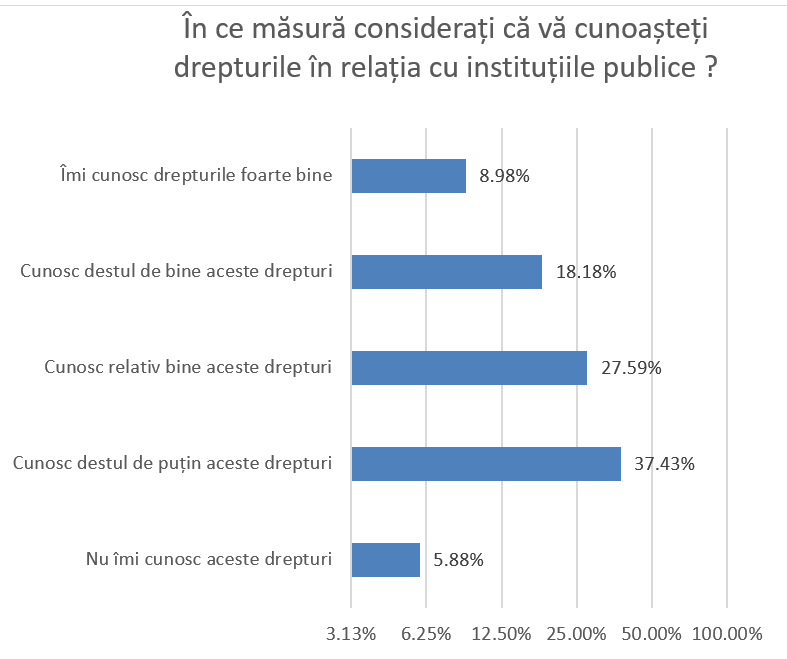 În ce privește sursa de informare privind drepturile pe care le au în raport cu instituțiile statului, 24,49% apelează la legislație; 1,28% la instituțiile statului; 22,46% se informează de pe internet; 2,35% de la apropiați și doar 7,17% apelează la avocați. 32,41% apelează la diverse combinații de surse de informare din cele anterior menționate.