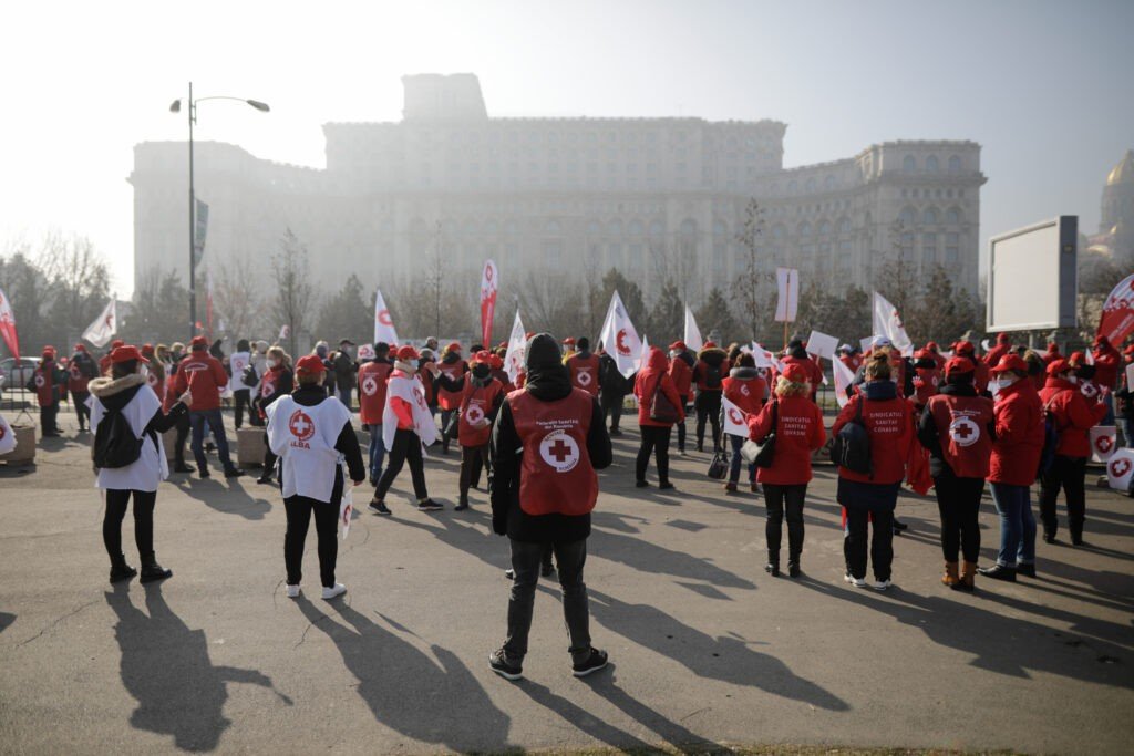 Federația Sanitas, care declară că reprezintă interesele a peste 120.000 de persoane din toate categoriile profesionale din sănătate, asistență socială și medicină școlară a organizat un protest la care au participat câteva zeci de persoane.