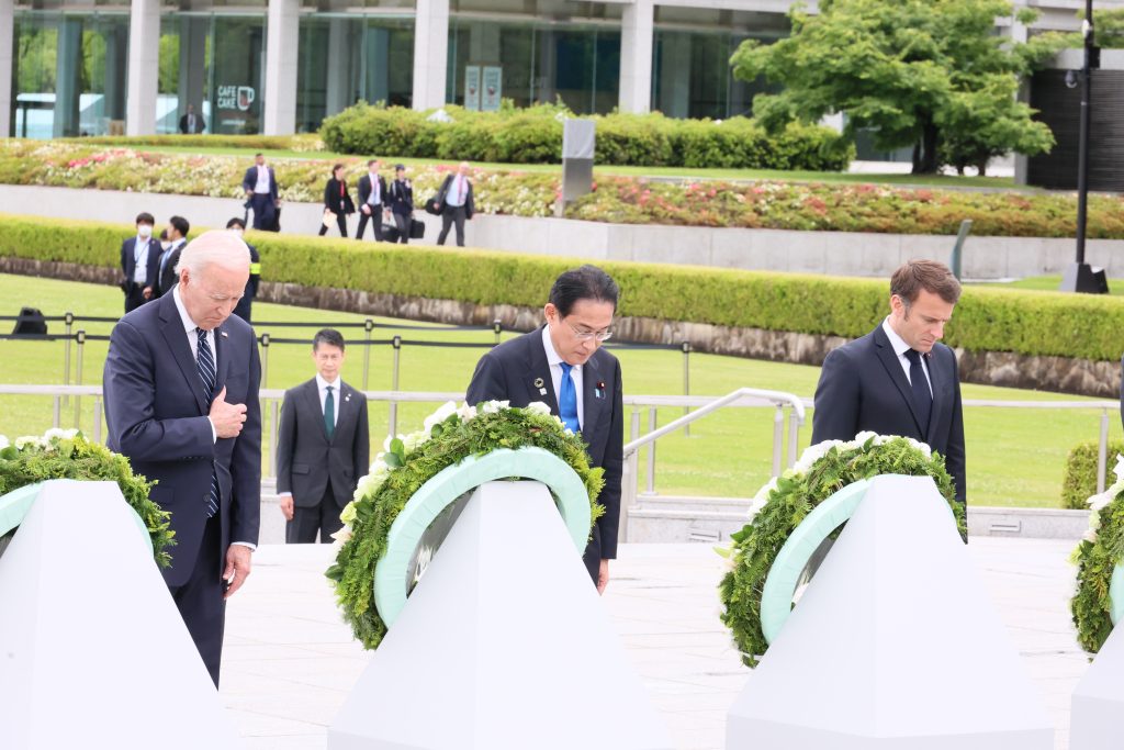 Joe Biden, președintele SUA, Fumio Kishida, premierul Japoniei, și Emmanuel Macron, președintele Franței, la depunerea de coroane la Memorialul Hiroshima Foto: g7hiroshimago.jp