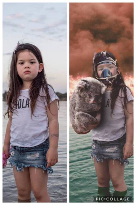 1.O fotografie în care apare o fetiță ținând în brațe un urs koala, pe un fundal în flăcări, este o imagine creată în Photoshop. Sursa acesteia este pictorița digitală Thuie.