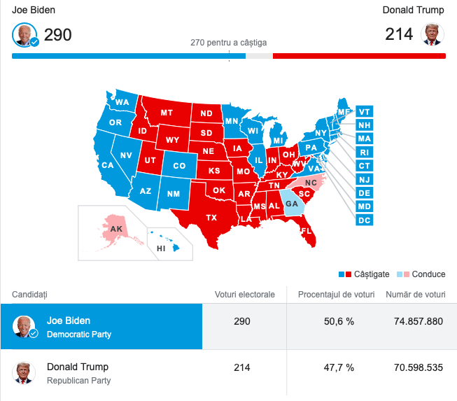 Biden a ajuns vineri la 290 de voturi electorale, după ce The Associated Press a prezis că statul Pennsylvania va fi câștigat de el. Biden a câștigat atât colegiul electoral, cât și votul popular.