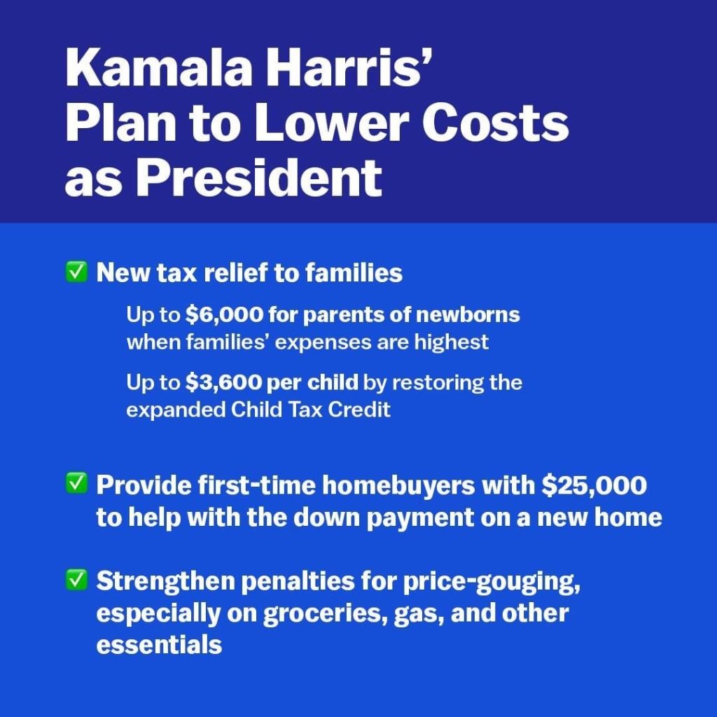 În timpul unui discurs ținut în statul Carolina de Nord, unde se duc lupte electorale, Harris a declarat, conform AP News, că „întărirea clasei de mijloc va fi un obiectiv definitoriu al președinției mele”, promovându-și planul de interzicere la nivel federal a prețurilor exagerate practicate de producătorii de alimente și de magazinele alimentare. Ea a propus, de asemenea, un ajutor de 25.000 de dolari pentru plata avansului pentru anumiți cumpărători de locuințe pentru prima dată și stimulente fiscale pentru constructorii de locuințe pentru începători.