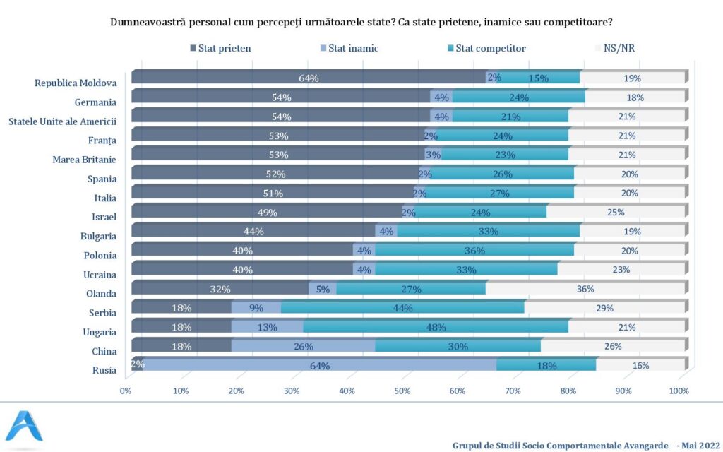 Între statele prietene enumerate de români se numără Republica Moldova (64%), SUA (54%), Germania (54%), Franța și Marea Britanie (câte 53%), Spania (52%), Italia (51%), Israel (49%), Bulgaria (44%), Ucraina și Polonia (câte 40%). Rusia este considerată stat inamic de 64% dintre români.