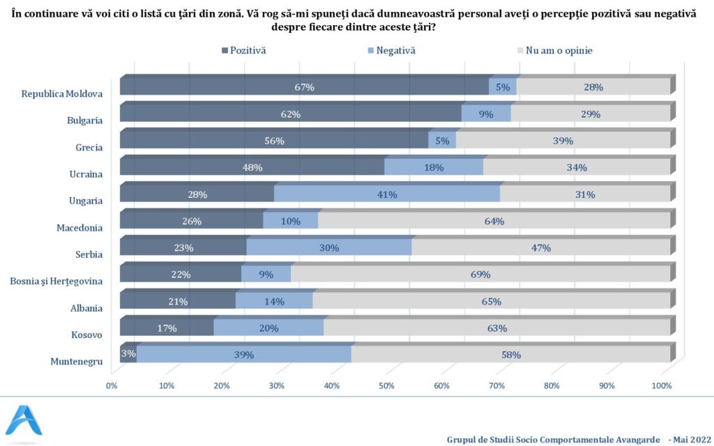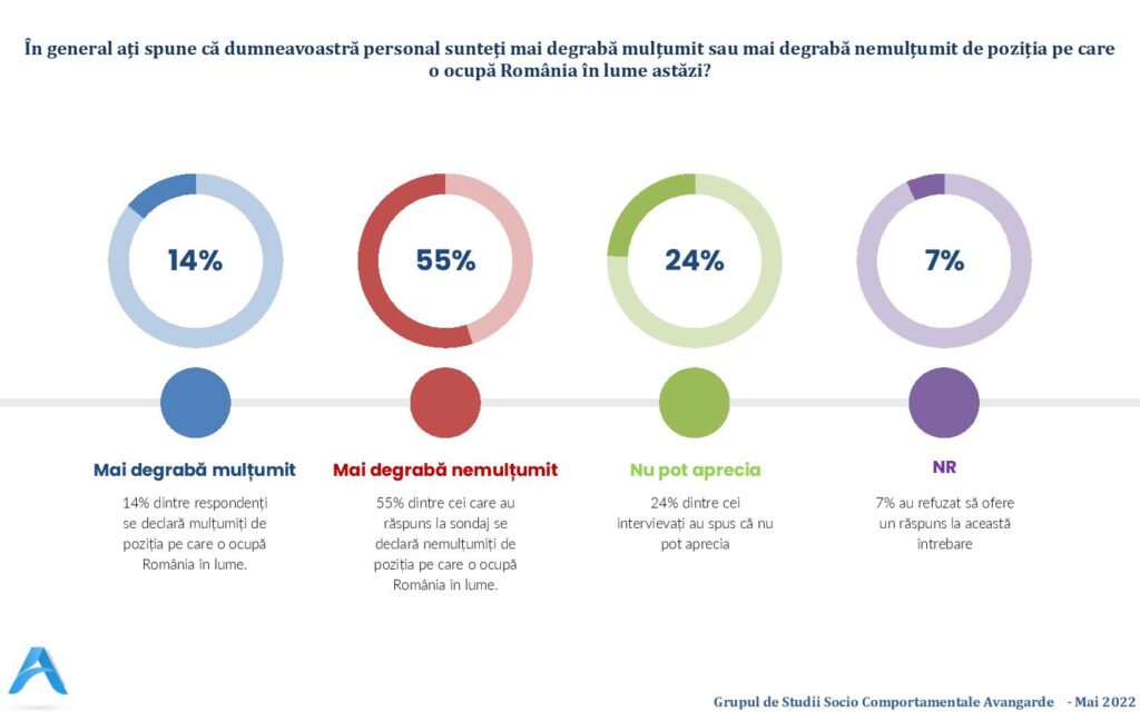 Ultimul sondaj Avangarde privind percepția asupra politicii externe, realizat în perioaca 10 – 18 mai 2022, arată că 48% dintre români cred că România este văzută mai degrabă negativ de către țările occidentale.