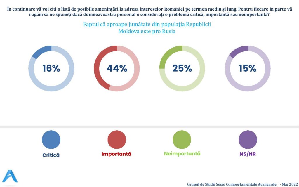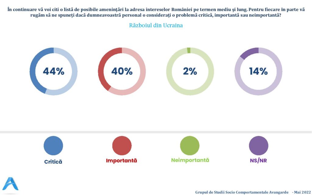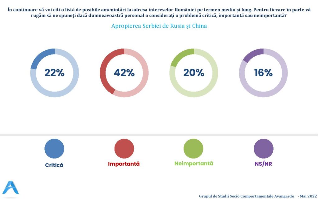 În lista unor „posibile amenințări la adresa intereselor României, pe termen mediu și lung”, 53% dintre cei întrebați au considerat că „investițiile Ungariei în Transilvania sunt o amenințare importantă”, 42% au catalogat la fel „apropierea Serbiei de Rusia și China”, în timp ce războiul din Ucraina este considerat de 44% dintre români „o amenințare critică”, iar de 40% – „o amenințare importantă”.