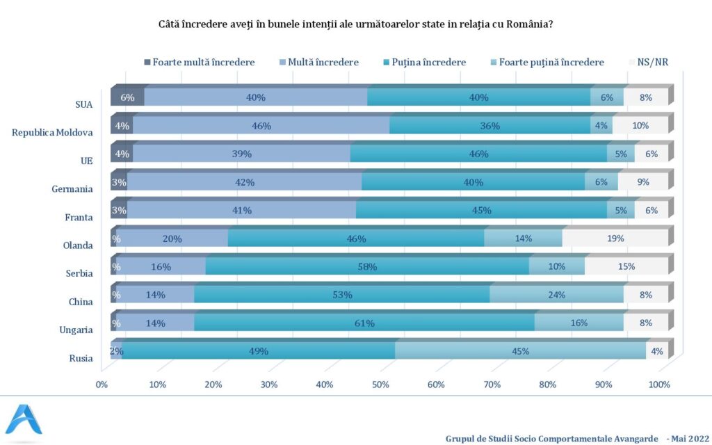 46% dintre români au încredere în bunele intenții ale SUA în relația cu România. De asemenea, 46% au puțină și foarte puțină încredere în bunele intenții ale Statelor Unite. .