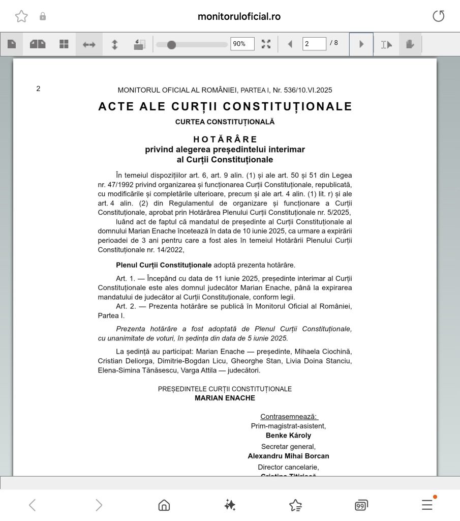 „Începând cu data de 11 iunie 2025, preşedinte interimar al Curţii Constituţionale este ales domnul judecător Marian Enache, până la expirarea mandatului de judecător al Curţii Constituţionale, conform legii”, se arată în decizia CCR publicată în Monitorul Oficial.