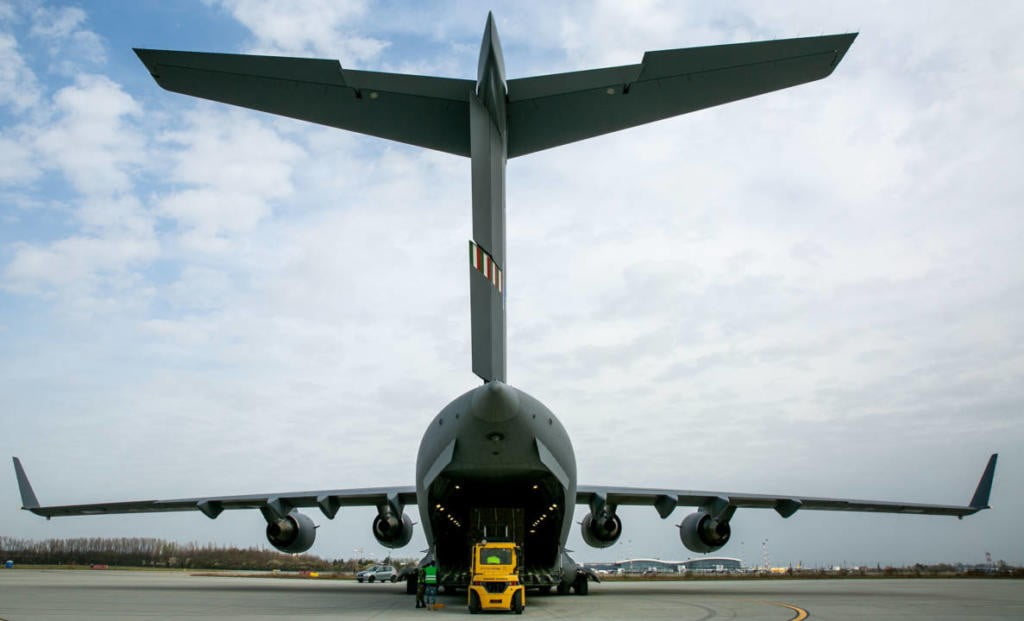 Un Antonov-124 sosește la Bratislava cu 48 de tone de echipamente medicale destinate luptei cu coronavirusul, cu sprijinul NATO. Foto: NATO