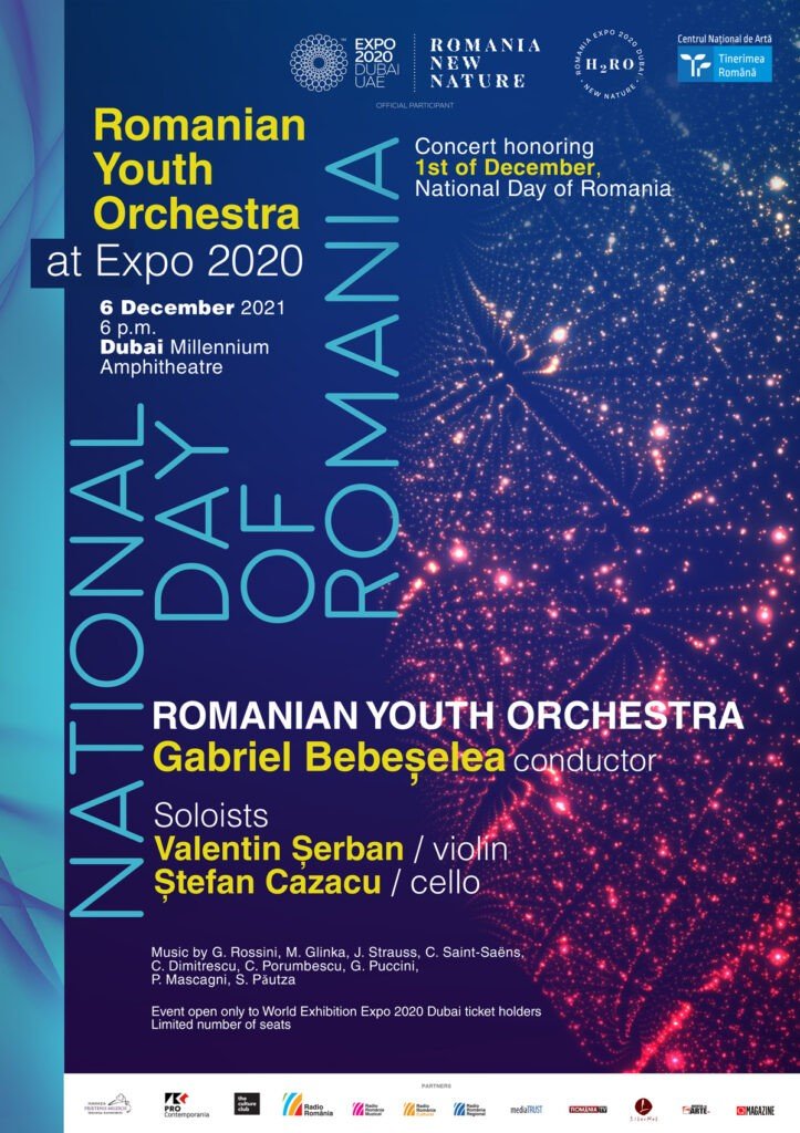 Orchestra Română de Tineret dirijată de Gabriel Bebeşelea semnează primul eveniment cultural românesc de anvergură de la Expo 2020 Dubai, solişti fiind laureaţii Concursului Internaţional „George Enescu” 2021, violonistul Valentin Şerban şi violoncelistul Ştefan Cazacu.