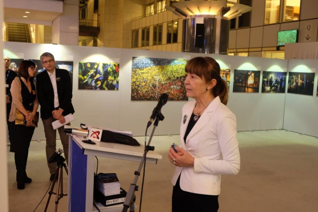 Monica Macovei vorbindu-le ziariștilor albanezi, în 2017 Foto Fb MM