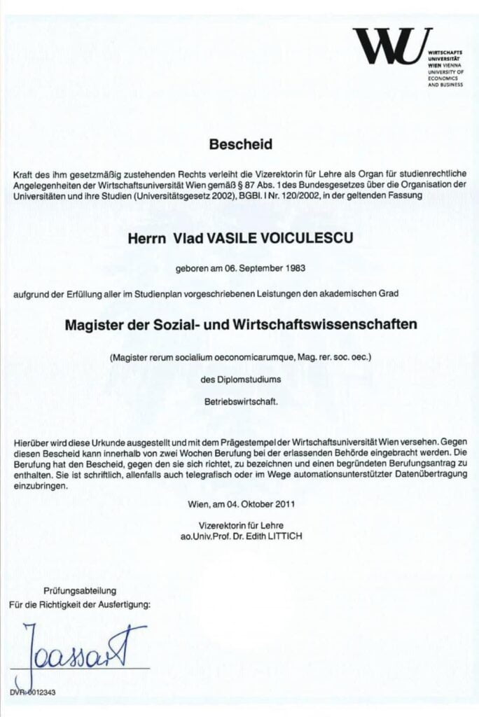 Cu această ocazie, făptuitorul Vlad Voiculescu a declarat că a obținut presupusa “diplomă” prezentată (netradusă, documentul fiind prezentat doar în limba germană!) la Vienna University of Economics and Business pe care a urmat-o la Viena timp de zece ani și doar la insistențele prietenei sale, întrucât, conform propriilor declarații, nu dădea importanță studiilor. Același document de atestare a fost eliberat, la rândul său, în baza aceleiași „Notificări” emise de universitatea din Viena privind absolvirea unor cursuri destinate studenților din Europa de Est, pe care făptuitorul Voiculescu a prezentat-o anterior ca fiind o diplomă de absolvire a ciclului master al universității.