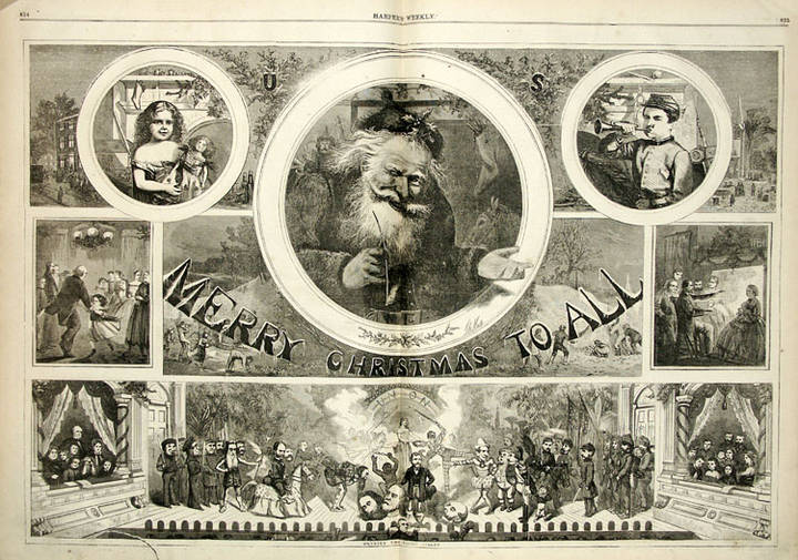 Ilustrația urează „Un Crăciun fericit pentru toți” și conține un portret pe care toți îl recunoaștem astăzi: Moș Crăciun. Desenul conține și alte imagini mici care arată tradițiile de Crăciun din anii 1860.