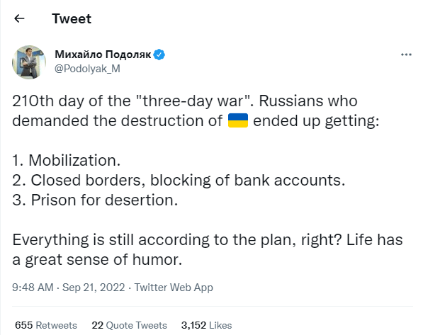 „Războiul nu merge în mod clar conform scenariului Rusiei și, prin urmare, ia cerut lui Putin să ia decizii extrem de nepopulare de mobilizare și restrângere severă a drepturilor oamenilor”, a declarat Mihailo Podoliak pentru Reuters.
