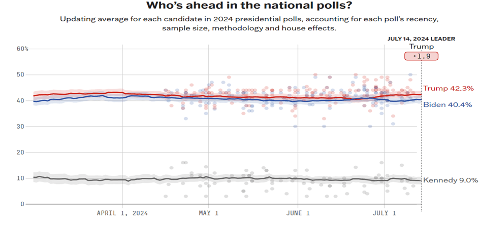 Înainte de tentativa de asasinare asupra lui Trump din 13 iulie, acesta conducea deja în sondajele naționale privind votul popular cu un avans de două procente.