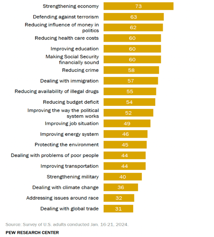 Restul subiectelor sunt preocupante doar pentru o minoritate dintre alegători: doar 40% vor întărirea capacității militare, doar 36% sunt preocupați de „schimbările climatice” și doar 32% de subiectele rasiale.