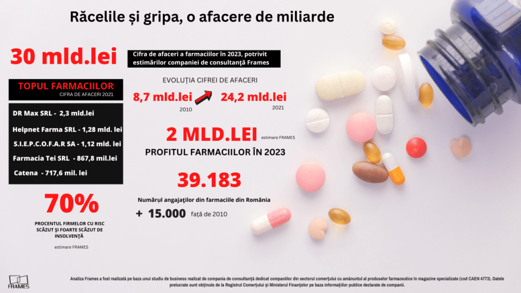 Potrivit unui studiu realizat de firma de consultanță Frames, afacerile celor peste 3800 de firme specializate în comercializarea cu amănuntul al produselor farmaceutice, în magazine specializate ( CAEN 4773), ar putea trece în acest an de nivelul de 30 de miliarde de lei.