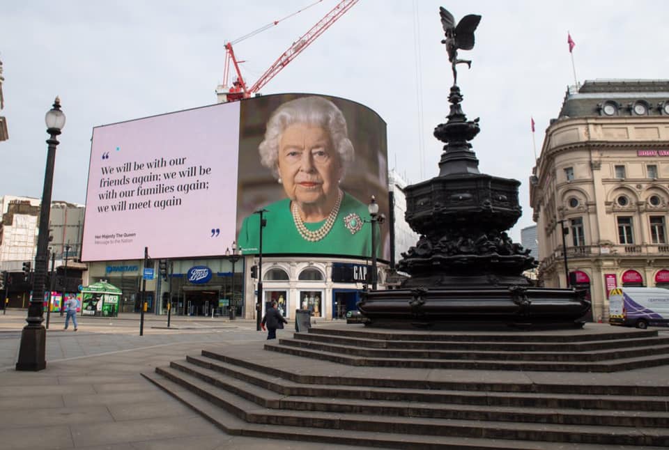 Cea de-a treia fotografie o reprezintă pe regină și un citat al ei afișat la Piccadilly Circus din Londra în aprilie.