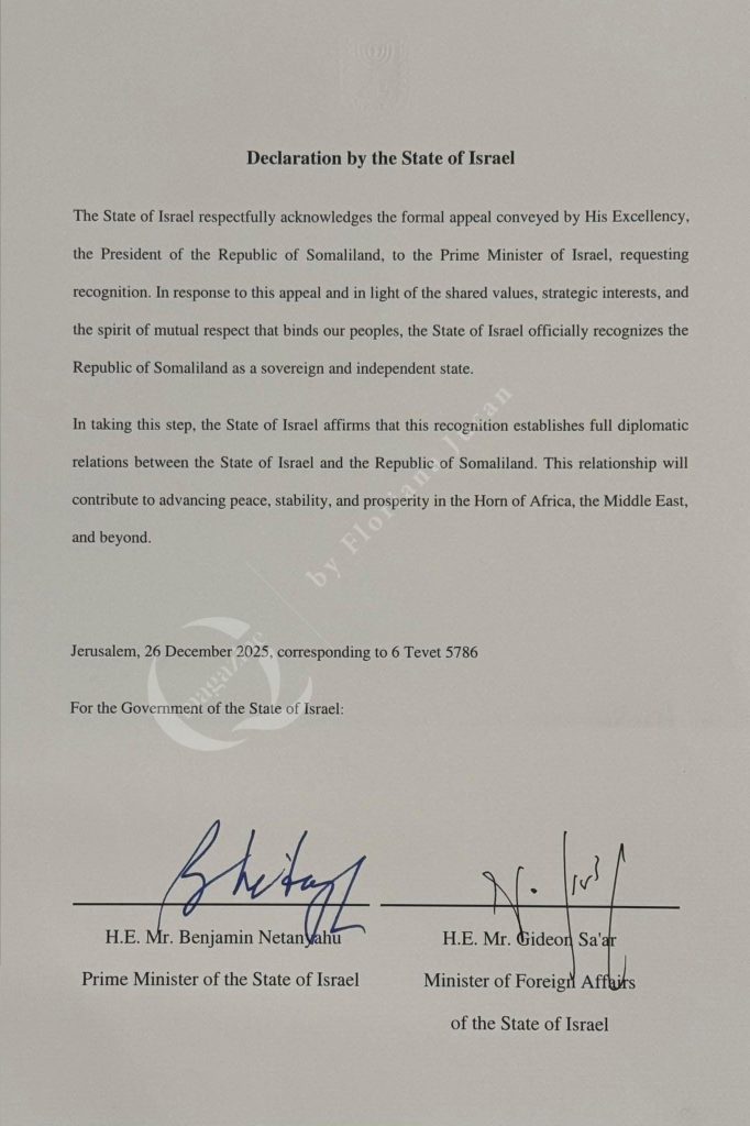 La 26 decembrie, potrivit unei declarații a prim-ministrului israelian Benjamin Netanyahu, Israelul a recunoscut oficial Somaliland – republica autoproclamată care s-a desprins de Somalia – ca „stat independent și suveran”. Israel este primul stat care acordă o astfel de recunoaștere.