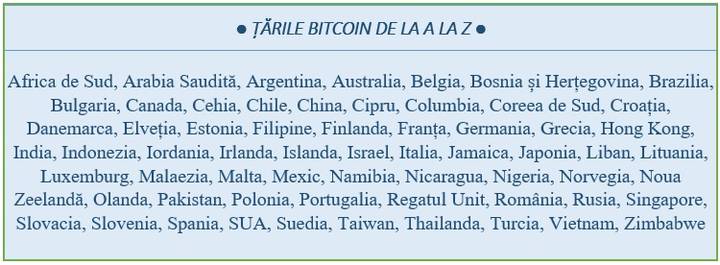 Bitcoin este cea mai cunoscută formă de monedă virtuală, care se folosește la nivel mondial. Există foarte multe țări care au legalizat utilizarea ei în plăți, dar și câteva excepții, cum ar fi: Bolivia, Ecuador, Kârgâzstan și Bangladesh. Majoritatea țărilor acceptă Bitcoin, iar o parte din ele au și mențiuni legate de limitări și atenționări, cum ar fi în Islanda și Vietnam. Situația din Rusia este încă neclară, deoarece moneda este folosită, dar nu este oficial legalizată sau incriminată.