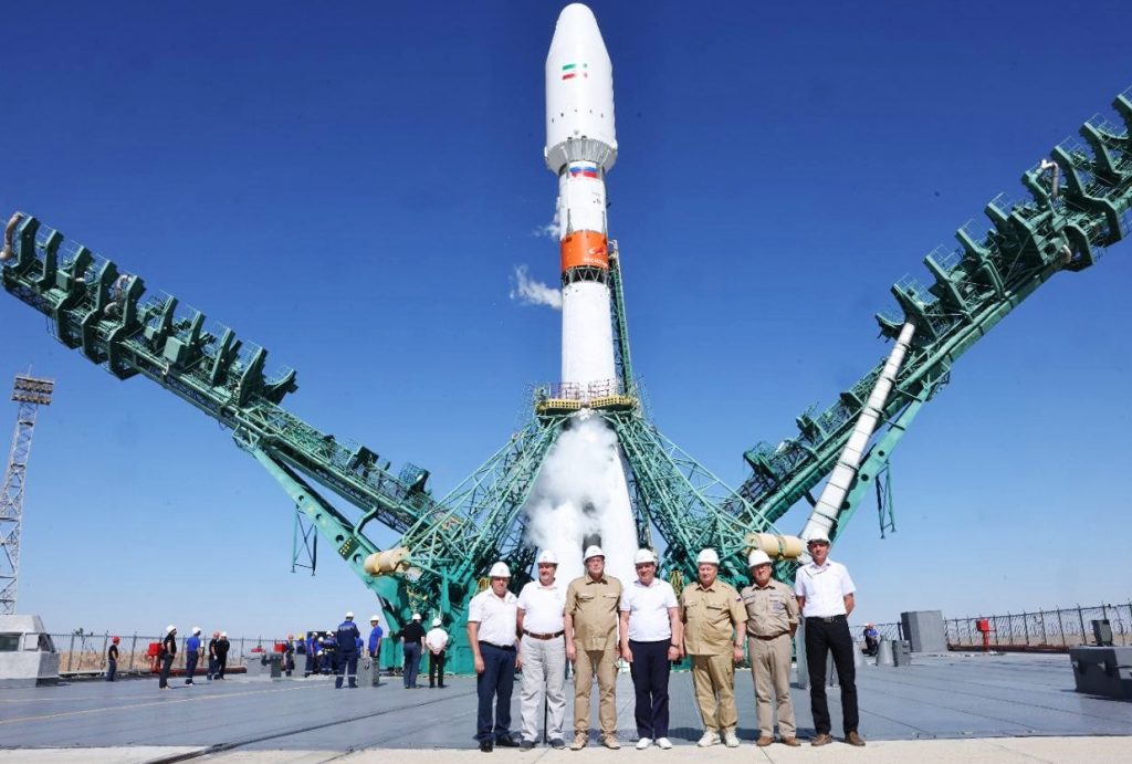 Președintele Roscosmos, Yuri Borisov, (în centru), în fața lansatorului Soyuz-2.1b cu câteva momente înainte de lansarea satelitului Khayyam de la Baikonur Cosmodrome, Kazakhstan. Foto Profimedia